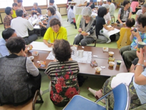 カフェに関しては、認知症の方はもちろん、その家族に寄り添うために、できるだけ参加者に声を出してもらえるように気を付けている。「健康の秘訣」、「生きがい」、「高齢者の暮らしにあったらいいサービス」など、各テーブルに、にこにこメイトが進行役として入り、話を引き出しながら、和やかな雰囲気の中で話ができるようにグループの時間を設けている。