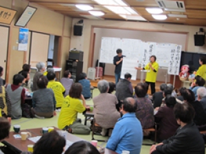 三川町内でも数名のキャラバン・メイトがそれぞれ活動をしていたが、土田さんはキャラバン・メイトの仲間と共に新たに「にこにこメイト」という組織を結成。認知症に関する正しい理解を持った認知症サポーターを養成することを目的に、認知症の人や家族が安心して暮らし続けることができる地域づくりを目指す。はじめは三川町の健康祭りを中心に、小学6年生とその保護者を対象として、寸劇を取り入れた笑いのある認知症サポーター講座を行った。