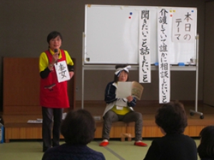 カフェの形式も、ホワイトボードを使った講義形式のものもあれば、みんなでグループに分かれてお茶を交えた座談会形式のものもある。また、認知症のテーマ以外にも、介護予防を話題にしたり、参加者に一番伝わりやすい方法で会を運営している。中でも参加者に好評なのが、寸劇を交えてのカフェだ。にこにこメイトのメンバーもみんな力が入り、ユーモアを交えて劇を演じることで参加者たちにも笑いが起こっている。