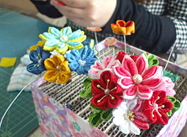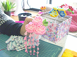 まず古いかんざしを分解して構造や色のバランスを調べるところから始め、基礎を身に付けた。ピンセットと接着剤を使いながら2~4センチ四方の布で鮮やかな花を作り、その花をアルミ製の骨組みにつけて完成。すべて手作業のため1点作るのに時間がかかり、物によっては完成までに数日かかることもあるそうだ。