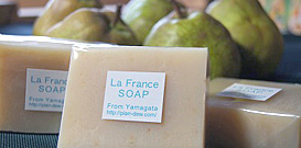 山形に来てまもなく、買い物中に偶然見つけてファンになった山形産米油をベースとして、地元の農産物などを練り込んだ石けんを販売している。