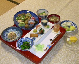昔から伝わるお膳と陶器に、通常は前菜や主菜などを盛り合わせて大体20品ほど。採れたての野菜、四季折々の産物があって、いろいろなアイデアを加えながら食卓にのせる料理をつくり上げている。