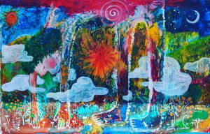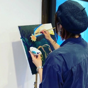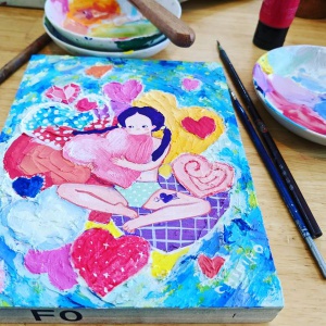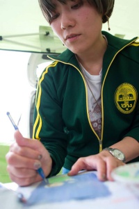 現在は絵本やイラスト製作の他に、2年前から、子どもに向けたライブペイントのアート活動を行っている。テーマを決めず、下地を塗ったベニヤ板にアクリル絵の具で自由に絵を描いてもらう。「これが良い、これが駄目」と批評するのではなく、「楽しく絵をかけたら正解」というスタンスだ。絵を描くことを好きになってほしいという願いから始めた活動で、マルシェなどでこれまでに10回ほど開催している。