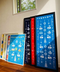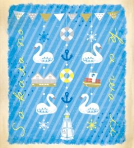 モノクロのアート写真とかわいい系のイラストでテイストは全然違うが、二人とも酒田に暮らしながら創作活動をしているということで、「酒田」を共通のテーマに二人展を開くことになった。その時に初めて、酒田のさまざまなものをモチーフにしてイラストを描いた。酒田といえば白鳥ということで、傘福で有名な「山王くらぶ」で見て印象に残っていた白鳥の吊るし飾りをイメージして、山居倉庫や北前船、日和山公園の灯台などと組み合わせて描いた「さかたのかわいい」のイラストが好評だった。この二人展がきっかけで地元の人にrikkoという存在を知ってもらえて、次第に酒田での仕事が増えていった。自分にとっては、ターニングポイントとなるとても大きな出来事だった。