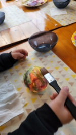 ワークショップで和紙を貼る作業