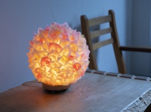 作品の形もシンプルな丸いあかりからブーケのようなあかり、しずくやつぼみの形をしたものなど、バリエーションを増やしていった。例えばブライダルのブーケをイメージしたあかりは、月山和紙の素材感を伝えたいと思って作ったあかりだ。柔らかく薄くてもコシがあって破れにくい月山和紙の特長を生かして、ちぎった和紙を1枚1枚ひねって貼った。しずくの形は、風船の中に水を入れ、上から吊るして和紙を貼った。風船が伸びたり動いたりして形が変わるので、使ったことのなかった厚手の月山和紙を使い、穴をあけてみた。すると穴からキラキラと光がこぼれ、暗い場所に置くとプラネタリウムのような空間になった。