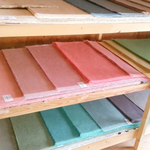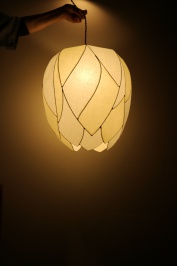 あかり作りに夢中になって、家にあった月山和紙をどんどん使っているうちに残りが少なくなってきたことに気がついた。色も生成りの1色だけだったので、いろいろな色の和紙も使ってみたくなり、他の和紙を取り寄せて使ってみたが、ゴワゴワしていてちぎった時のふわふわした手触りや毛羽立った感じが全く違った。作業もしにくく思うような形が作れない。いろいろと試してみたものの、月山和紙のような風合いのあかりができなかった。