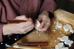 試しに仏壇の扉に使う小さな彫り物を模刻して、それを大槻社長に見せると、「彫れるならやってみるといい」と言われた。これが縁で、先人の作品を師匠に「仏壇のおおつき」内で仏壇彫刻の仕事を始めた。