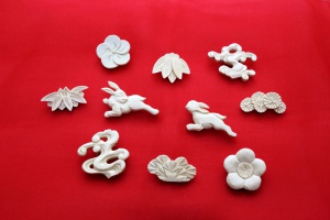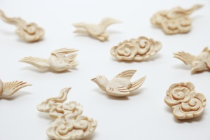 山形市では毎年、「やまがた伝統的工芸品展」が開催されている。以前は山形市役所に作品が展示されたが、2009年に観光拠点の「山形まるごと館 紅の蔵」がオープンするとこちらに会場が移り、展示だけでなく販売もできるようになった。この伝統的工芸品展に「山形みらいの匠会」の一員として参加していたものの、彫刻した物は仏壇屋さんに卸し、一般のお客さんに販売することはなく、販売する物もなかった。そこで、山形仏壇のことを少しでも知ってもらえるよう、身近に使える小物を作ってみようと考え、鳥や雲など仏壇のモチーフを手彫りして裏側にピンを付け、バッジにして販売していた。