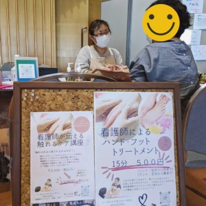 コロナ禍も少しずつ落ち着いてきた頃、マルシェに誘われて出店した。何度か出店するうちに、看護師でセラピストの自分のように、看護師の資格を持っているけれど違う分野の仕事をしている人もいるのではないかと思い、軽い気持ちで「看護師が集まるマルシェ」を企画し募集してみた。すると反響があったため、2022年6月に初めて「Nurseマルシェ」を開き、看護師や保健師、助産師たちが、健康や子育て、介護などの相談を受けた。このマルシェが縁で介護職や福祉関係の人たちとつながり、9月におこなった2回目のマルシェは「PURONOマルシェ」と名称を変えて開催した。医療・介護・福祉などの分野で専門資格を持つプロが集まったマルシェだ。当日は、会場に設けた各ブースでプロが相談にのり、小物やお菓子の販売やミニイベントなどもあって多くの来場者でにぎわった。出店者同士のつながりもでき、また輪が広がった。