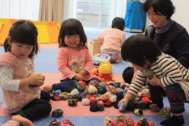 時にはメンバー全員で集まり、昔懐かしいお手玉や、牛乳パックを利用した積木など、遊びの広場で使用するおもちゃを手作りしている。 「毎年、子育て応援団養成講座を修了した方が次々に入会してくれるので、現在のところ人手不足の心配がない状況です。皆さん活動に対してとても積極的なので、本当に助かっています。」