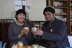 ぷろぺら商店は、鈴木公人さんと、てづかまよさんの2人が2012年に開業。現在は、南陽市にて、陶芸教室、陶芸作品などの製作・販売、また県内外各地で作品展などを行っている。